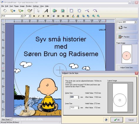 Når billedet er lavet kopieres det via udklips holderen og pastes ind i CD label programmet og det lægger i boxen. Man kan stille ydre og indre diameter. I standard indstillingen er det printbare område 43 mmØ (+/-10 mm) til 116 mmØ ( +2mm/-10 mm), men ved at gå ind i “Select Paper” kan man ændre udskrifts området til 17 mmØ til 118 mmØ. (mmØ = millimeter i diameter)