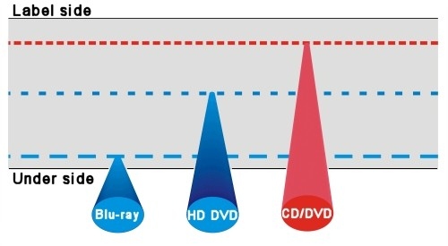 De 3 dataspor ligger i forskellige niveauer i pladen og ved at focucere laserstrålen, kan man vælge hvilket lag man ønsker at afspille. Illustrationen er kun til orientering.