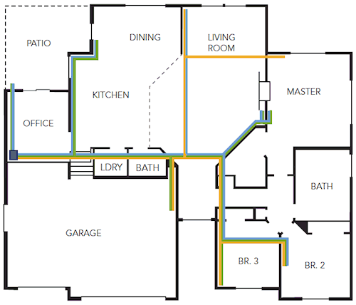 Nedenfor et eksempel fra HomeGrid Forum, på hvordan apparaterne i hjemmet kunne snakke sammen på kryds og tværs, via eksisterende kabler.