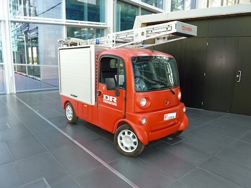 Og ingen brandmænd uden en brandbil, så det fik DR også. Ikke nogen stor brandbil, men en lille snild en der kan smyge sig rundt i Indre Gade og nogle af segmenterne. Med en stige på taget, så de bedre kan hjælpe hvis det bliver nødvendigt.