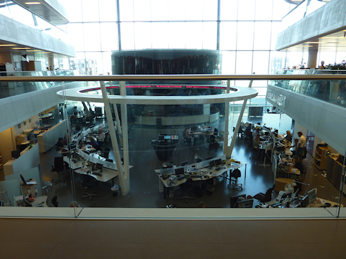 DR newsroom set ovenfra. Cylinderen i baggrunden er TV-Avisens studie (Foto: recordere.dk)