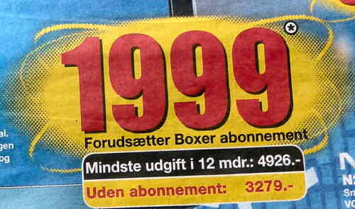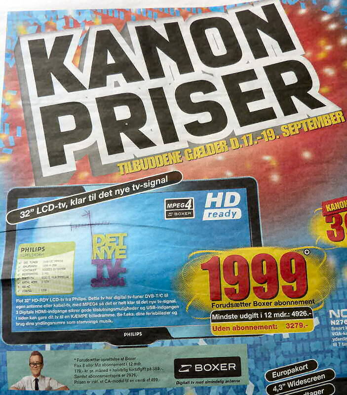 I dagens udgave af BT ses en annonce fra Elgiganten (billedet), hvor man kan købe et 32″ Philips fladskærms-tv for 1.999,- mod at tegne et 12 måneders Boxer abonnement. Uden abonnement koster samme kr. 3.279,- og med i den lave pris følger også det nødvendige CAM (CA-modul) til en værdi af kr. 499,-