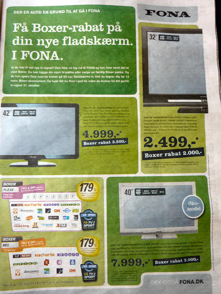 Lignende tilbud ses i dagens udgave af Urban, hvor Fona sælger forskellige TV med Boxer abonnement. Et 32″ Sony TV sælges til 2.499,- (Rabat: 2.000 kr), et 42″ Philips til 4.999,- udløser en rabat på 3.500 kr, mens et andet Sony 40″ sælges med en pæn rabat også. Se det tilbud her.
