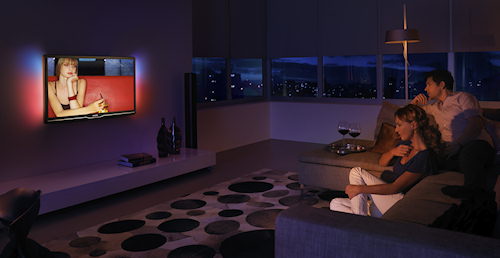 Philips? Ambilight-teknologi kaster farver, der svarer til dem på skærmen, op på væggen omkring tv-skærmen. Billedet bliver nærmest tredimensionelt og tv?et træder frem fra væggen ? resultatet er en forstærket seeroplevelse. Og ser du tv længe, er der den ekstra fordel, at det er mindre anstrengende for øjnene.