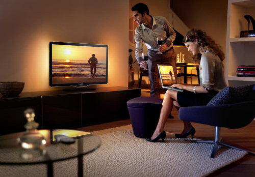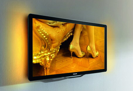 Det er Ambilight TV, af typen Ambilight Spectra 2. Ambilight er lyset udenom TV’et, der forstærker stemningen fra billederne på skærmen. Denne nye type Ambilight afkoder også væggenes farver, så de optimale farver gengives også selvom væggen ikke er hvid.