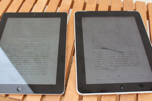 Dertil kommer, at den nye iPad er en smule lettere at bruge i dagslys, dels på grund af det lille løft i lysstyrken, og dels på grund af den større skarphed. Det er dog langt fra lige så let at læse noget på den, som det er på en Kindle med e-Ink, når man står udenfor. På billedet nedenfor kan man se, at der er en væsentlig forskel på, hvor tydelig teksten står i dagslys på iPad 3 i forhold til iPad 1.