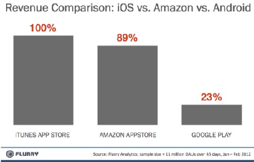 Ifølge Flurry handler det slet og ret om, at Google bare ikke er gode til at drive butik, modsat Apple. Det er også forklaringen på, at Amazon tjener næsten lige så mange penge på at sælge apps i deres app-butik som Apple gør.