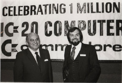 Jack Tramiel (tv.) fejrer sammen med en af Commodores andre ledende figurer, Michael Tomczyk, at firmaet havde solgt en million eksemplarer af C64’erens forgænger, VIC-20. En revolution lå stadig forude i deres fremtid. (Foto: MOS6502/Michael Tomczyk)