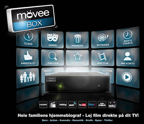 MoveeBox er en box til streaming. Den købes på selskabets website www.MoveeBox.dk, og den er desuden på vej ud i landets store elektronikkæder. Herefter kan man købe sig til video on demand på to måder: