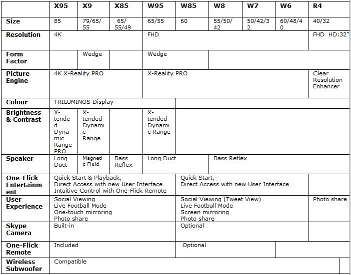 Der er også HDMI 2.0 i alle de nye 4K UHD TV, så de understøtter 4K video i 50/60 Hz. Andre nyheder kan nævnes MHL 3.0, som understøtter 4K-output fra smartphones og tablets, og desuden en ny signalprocessor, der understøtter HEVC (H.265, High Efficiency Video Codec) og afspiller 4K/60p-indhold fra online streaming-tjenester, så som Netflix.