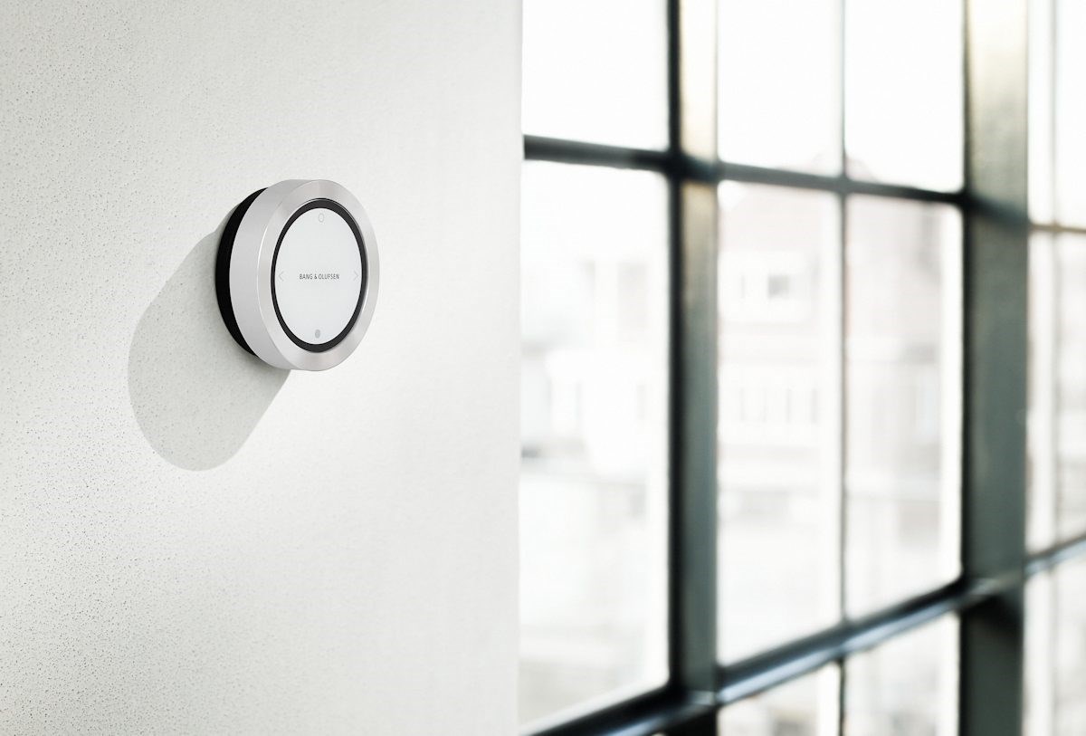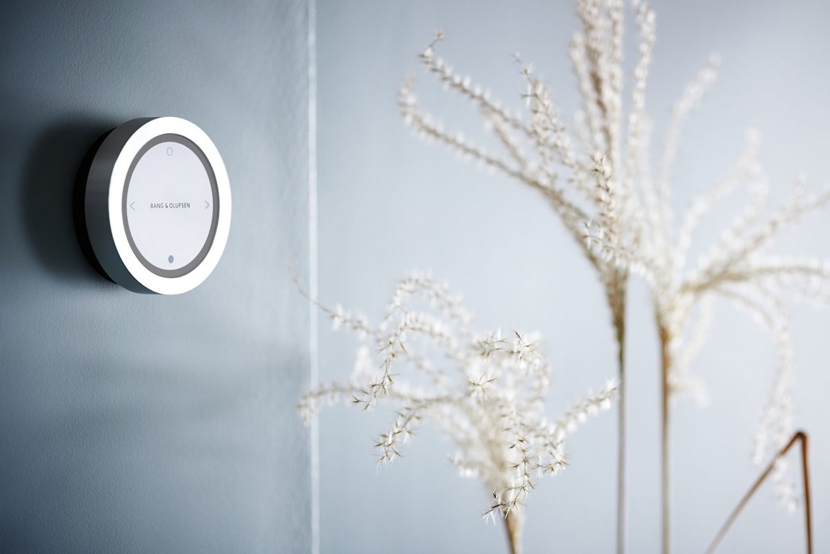 Musikken styres via fjernbetjening og smartphone. Den runde enhed på billedet er fjernbetjeningen, der kan hænges på en væg eller ligge på bordet.