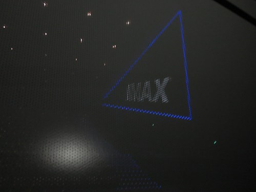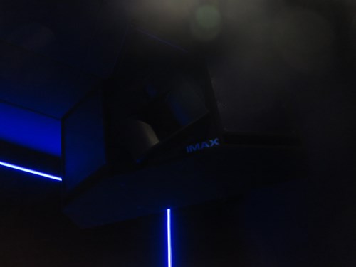 Salen er fyldt med blåt lys og IMAX branding, der dog slukker under filmen.