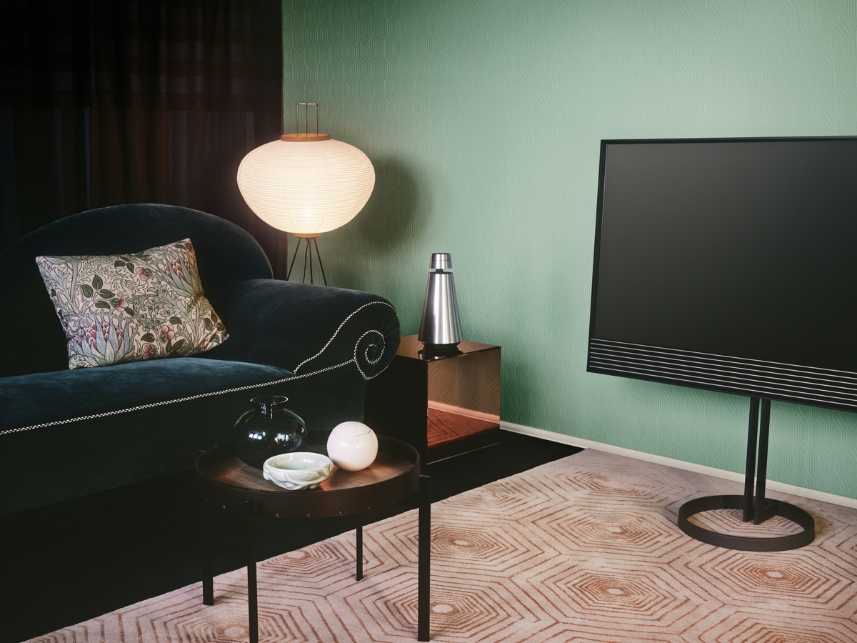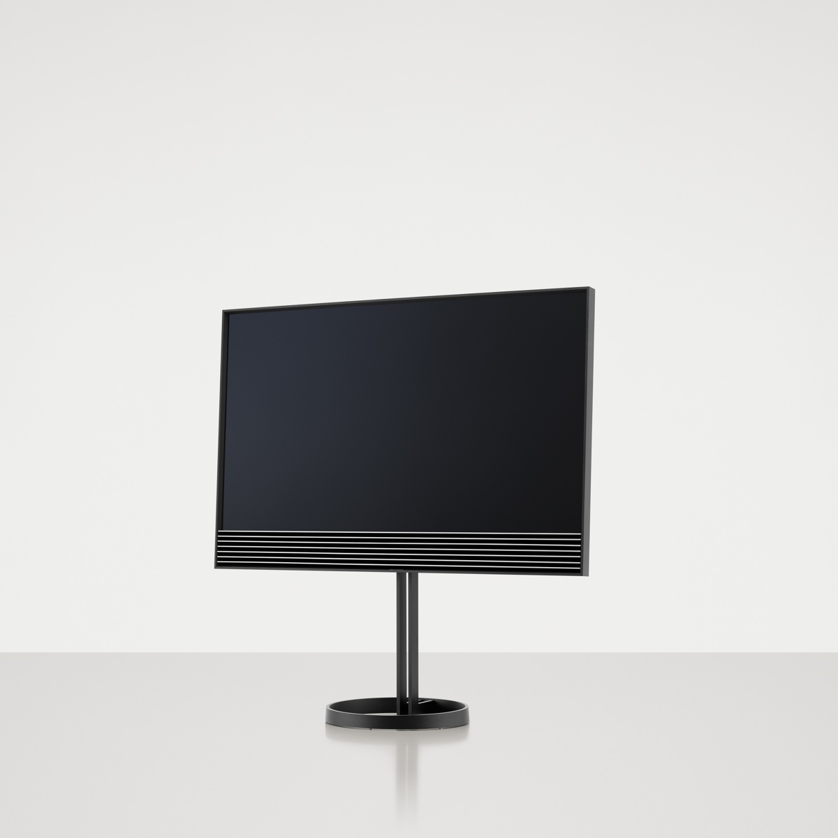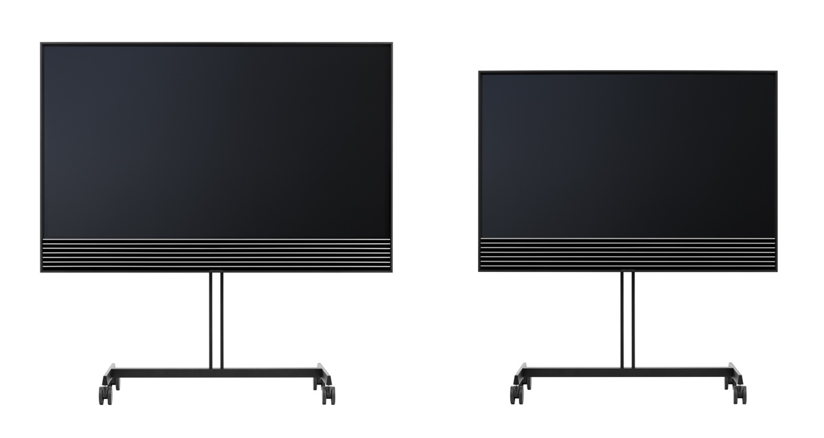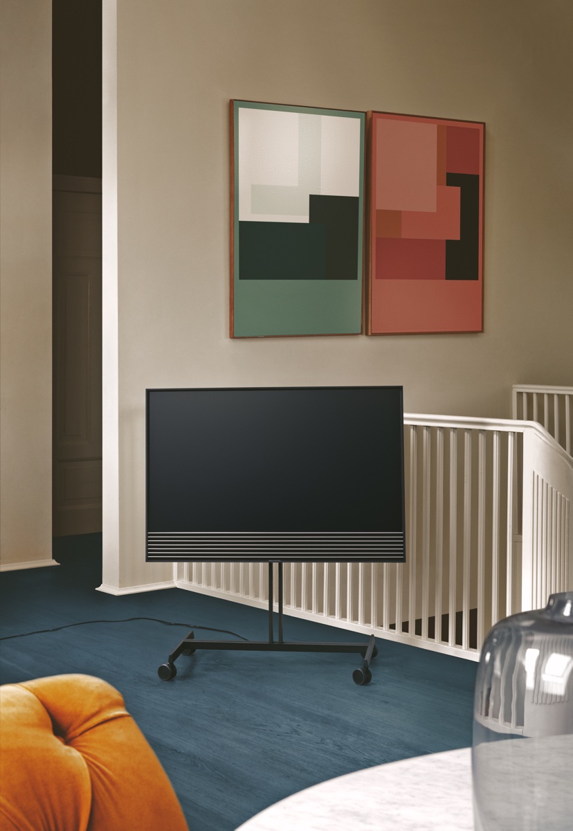 BeoVision Horizon kan monteres elegant på væggen, på en hjulstand, på en gulvstand, der kan dreje 360 grader, eller ‘skødesløst’ tilbagelænet på en staffelistand på gulvet.