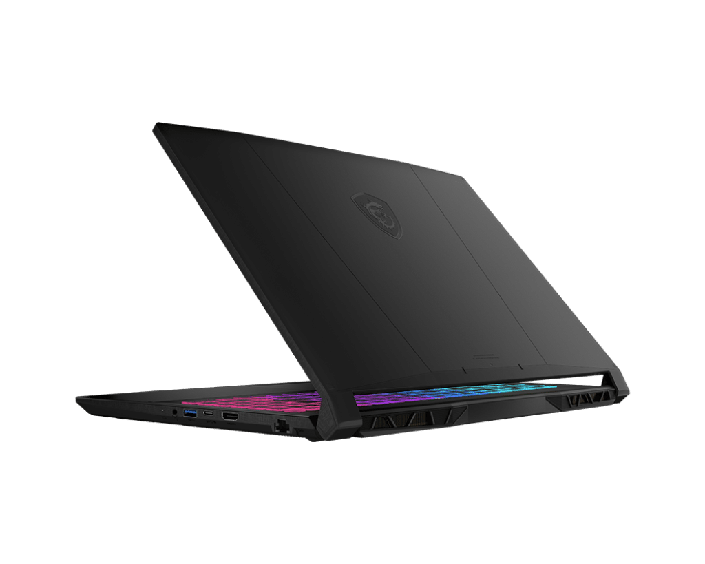 Designet på MSI Katana 15 er ikke skræmmende. Den er lavet i hård plast og den kommer med 1 USB-C (USB 3.2 Gen1), 2 USB-A (USB 3.2 Gen1) og 1 USB-A 2.0 porte, der alle sidder på siderne, oven i det får du HDMI 2.1 (8K @ 60Hz / 4K @ 120Hz) udgang og en RJ45 Gigabit Ethernet udgang. Du får også WiFi 6 og Bluetooth 5.2. Og så har Katana 15 altså en fed feature, for du kan faktisk hvis du har lidt teknisk snilde åbne computeren og selv opgradere RAM til op til 64GB DDR5 og der er også 2 NVMe M.2 pladser, så du kan øge pladsen. Og for folk der spiller pladskrævende spil, der er det en rigtigt god funktionalitet at tilbyde. Også det indbyggede WiFi 6 modul kan udskiftes hvis der senere kommer et hurtigere.