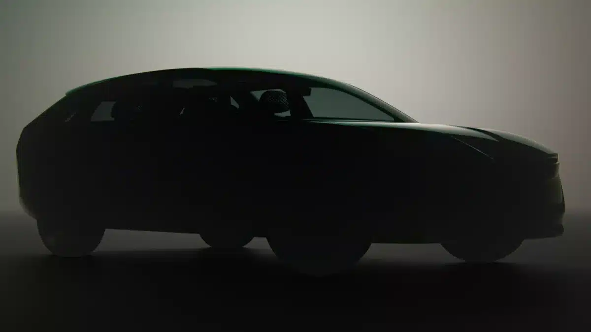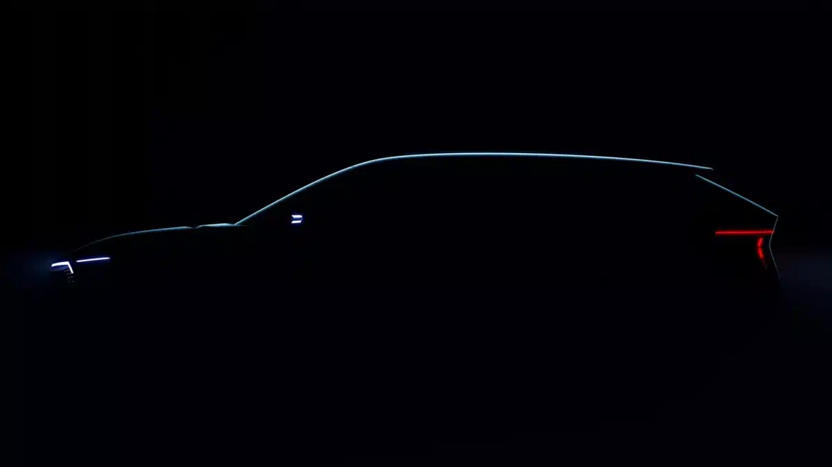 Det eneste officielle billede viser en silhouet af en stationcar med lav taglinje og skråtstillet bagklap. Designet lægger sig op ad Audis A6 e-tron Avant, men Skoda fremhæver sin egen LED-signatur og designlinje kaldet Modern Solid.