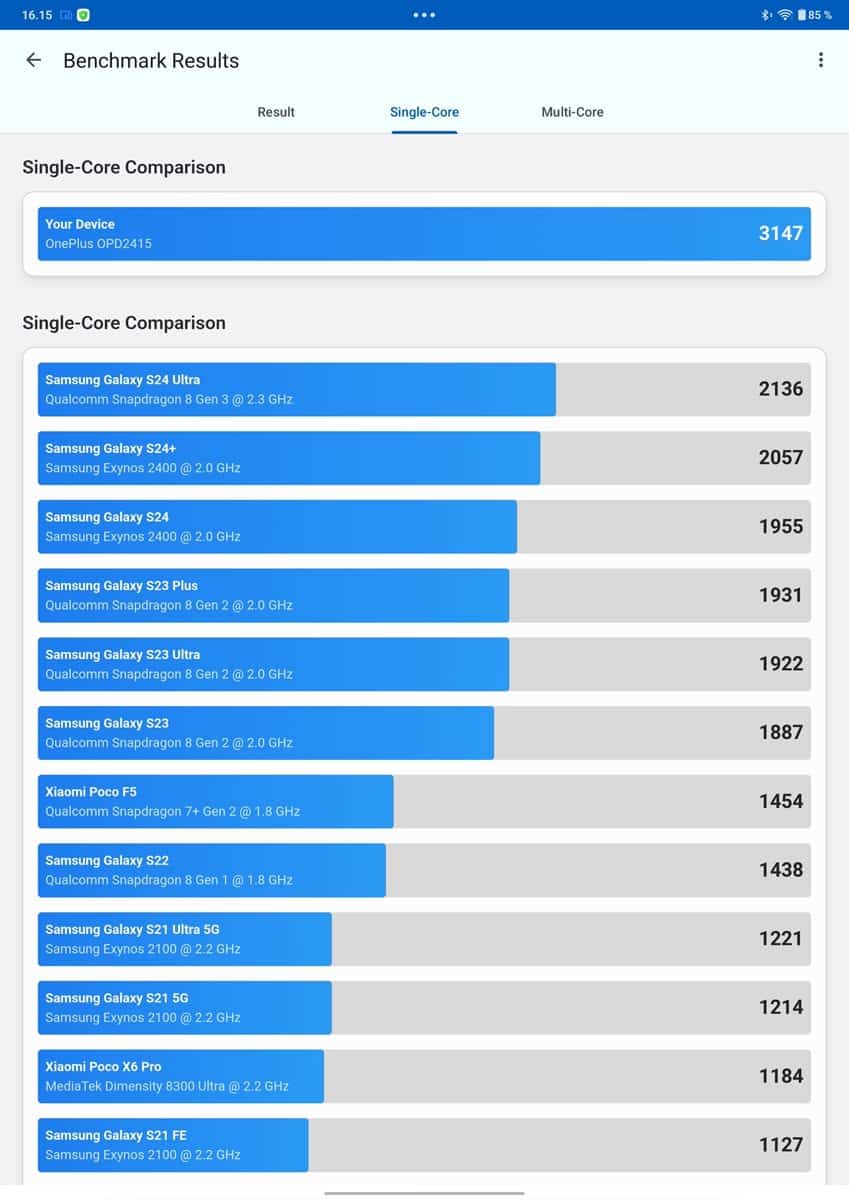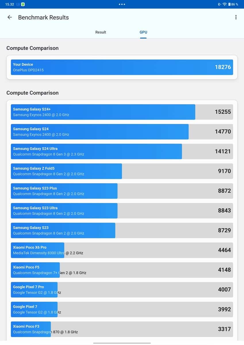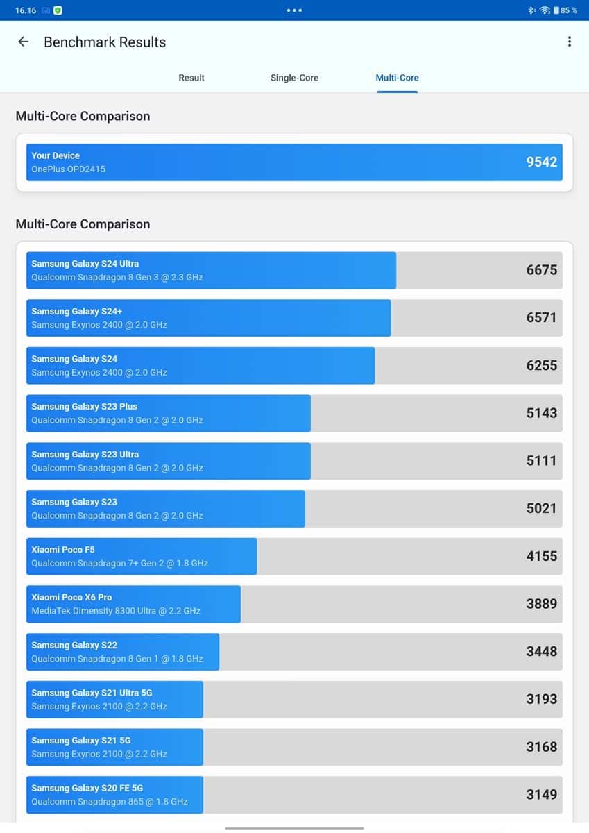Pad 3 kører med Android 15 og Qualcomm Snapdragon 8 Elite-chippen, hvilket sikrer en ydeevne på niveau med de nyeste high-end smartphones. Geekbench 6 scoren for CPU’ens single-core og multi-core performance ligger på henholdsvis 3147 og 9542. GPU’en ligger på 18274 i score.