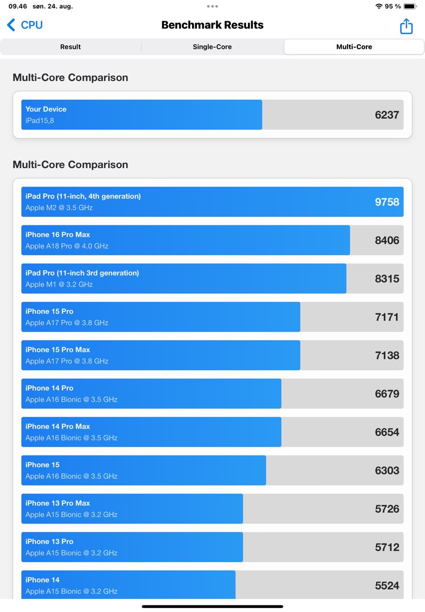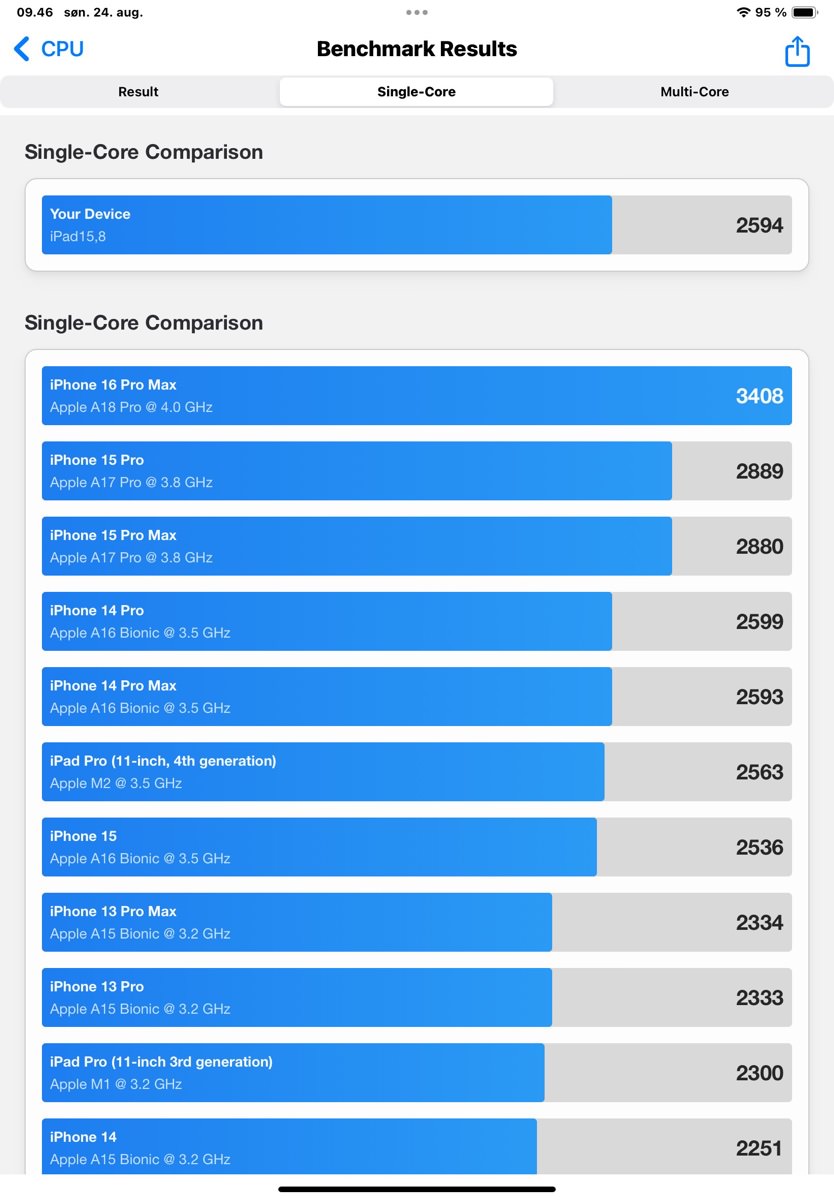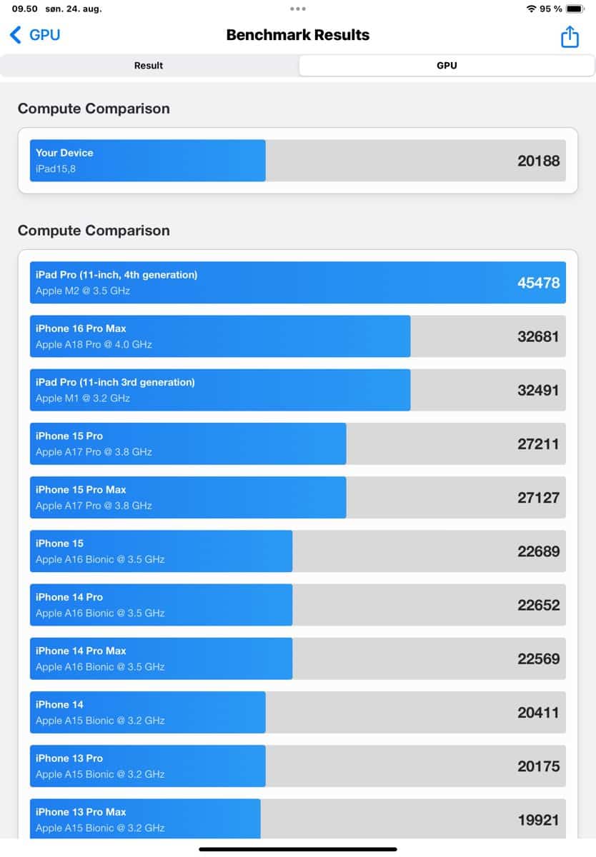 A16-processoren indeholder fem kerner. Jeg har fået Geekbench 6 til at lave en benchmark af både CPU og GPU. Single-core ydeevnen får en score på 2594, hvilket er på niveau med en iPhone 14 Pro Max. Multi-core ydeevnen ligger tæt på en iPhone 15 med en score på 6237, mens GPU’en med en score på 20188 performer som en iPhone 13 Pro. Ikke verdens mest imponerende resultater, men dette er heller ikke Apples topmodel med M-chippen – og prisen er derefter.