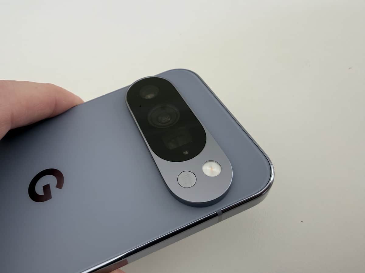 I toppen finder du SIM-Skuffe, hvor der er plads til ét Nano-SIM kort, ligesom du kan have eSIM i telefonen også (dog kun 2 aktive samtidigt). På bagsiden finder du kamera som ligesom på Pixel 9 Pro XL dækker på tværs, og derfor er telefonen super stabil når den ligger på bordet.