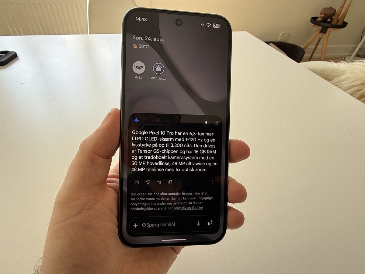 Google Pixel 10 Pro familien kommer med den nyeste opdatering af AI, så du har nu Gemini som standard, og det er fantastisk. Især når du bruger Gemini Live, hvor du taler med assistenten, kan du holde en samtale igang længe. Og en af nyhederne i Google Pixel 10 Pro familien er at store dele af Gemini Nano AI kører lokalt på telefonen.