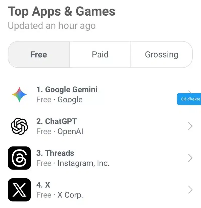 Googles Gemini-app indtager nu førstepladsen på listen over gratis apps i den amerikanske App Store. Det sker foran konkurrenten ChatGPT og det sociale medie Threads.