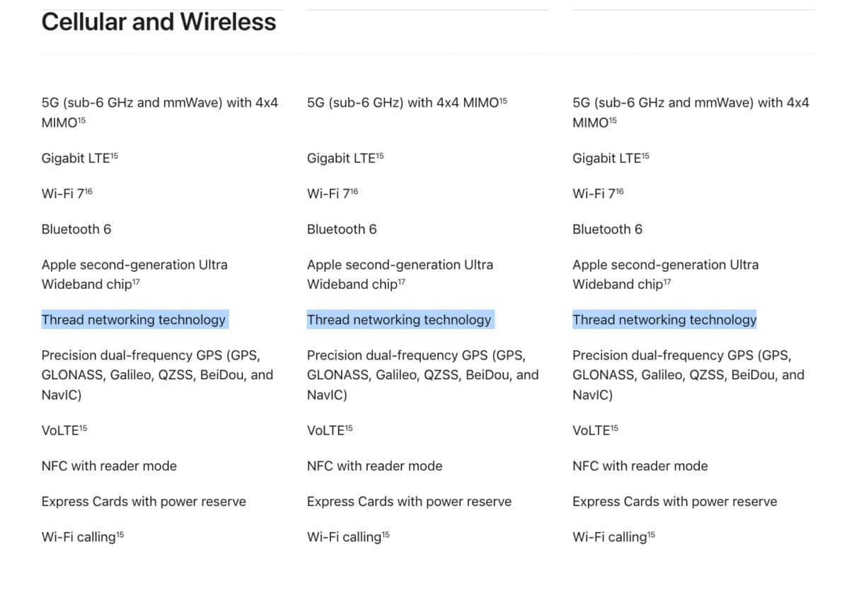 Thread blev kun nævnt i forbindelse med Air-modellen. Men det viser sig faktisk, at alle tre nye iPhones har Thread ombord. Det Men det var ret småt med nyt om, hvorfor der er en Thread-radio i iPhones nu. Den åbenlyse grund til at der nu er Thread i en iPhone er dog, at det flugter med, hvad vi har hørt om Apples fremtidsplaner.