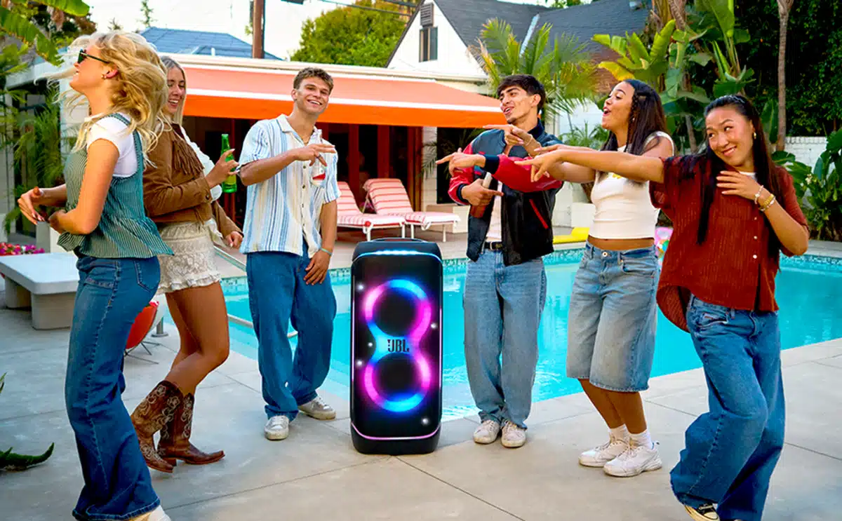 Sound Tower-højttalerne har også LED-discolys ombord med forskellige mønstre. Modsat billederne ovenfor, skal man nok være forsigtig, når man bruger disse højttere omkring en pool. Såvel Samsung Sound Tower-boksene som PartyBox 720 har IPX4-certificeringer. Det svarer i praksis kun til modstandsdygtighed over for vandstænk.