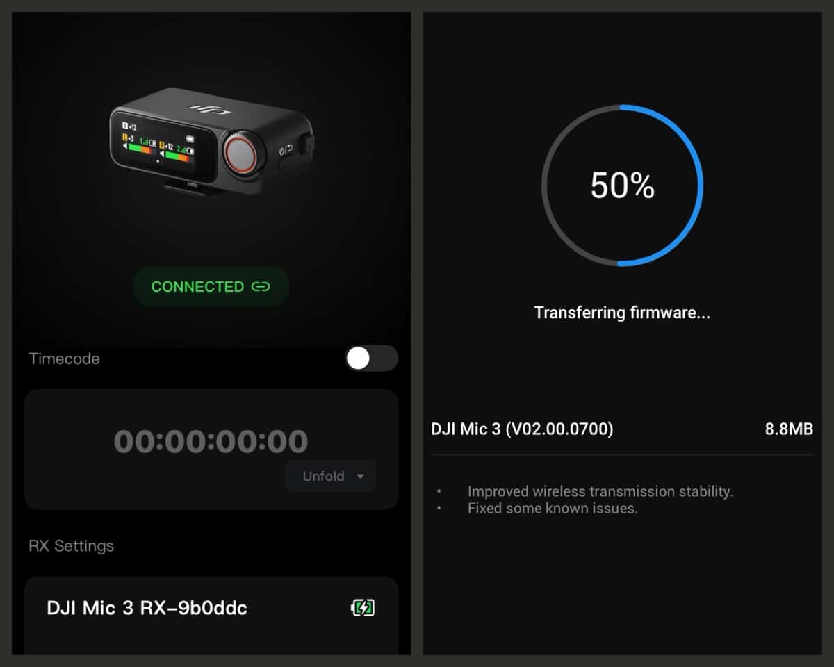 Det kræver nærmest ingen installation, at komme i gang, men der er enkelte indstillinger, som kun kan sættes, hvids man bruger DJI MIMO app’en som findes til både Android og iOS. En ting som er lidt træls, er at man kun kan firmware opdatere mini-modtager og mikrofoner via bluetooth, også selvom man har tilsluttet enhederne direkte via USB-C på den smartphone der har DJI MIMO app’en kørende.