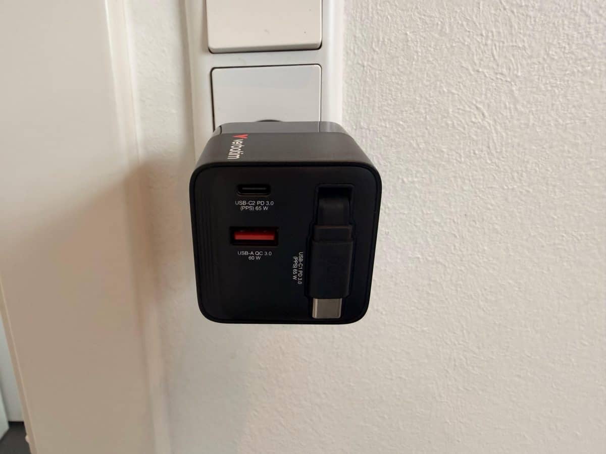 Som rejselader kan 65W GaN laderen være praktisk. Den kommer med indbygget USB-C kabel, samt to yderligere stik, et USB-C og et USB-A.