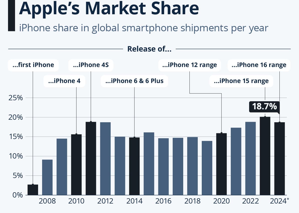 Når man ser på Statistas oversigt over, hvilke iPhone-modeller, der øgede Apples markedsandele over det meste af telefonens historie er det som regel, når en ny iPhone med et andet udseende blev lanceret, at Apples generelle andel af smartphone-markedet går op – enten i det første eller andet år af et nyt designs levetid.