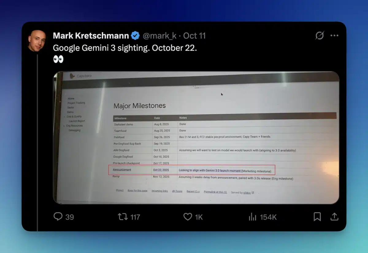 Et billede af Googles interne milepælsplan cirkulerer på sociale medier og viser angiveligt en tidslinje for lanceringen af Gemini 3.0. Ifølge billedet er en offentliggørelse planlagt til den 22. oktober.