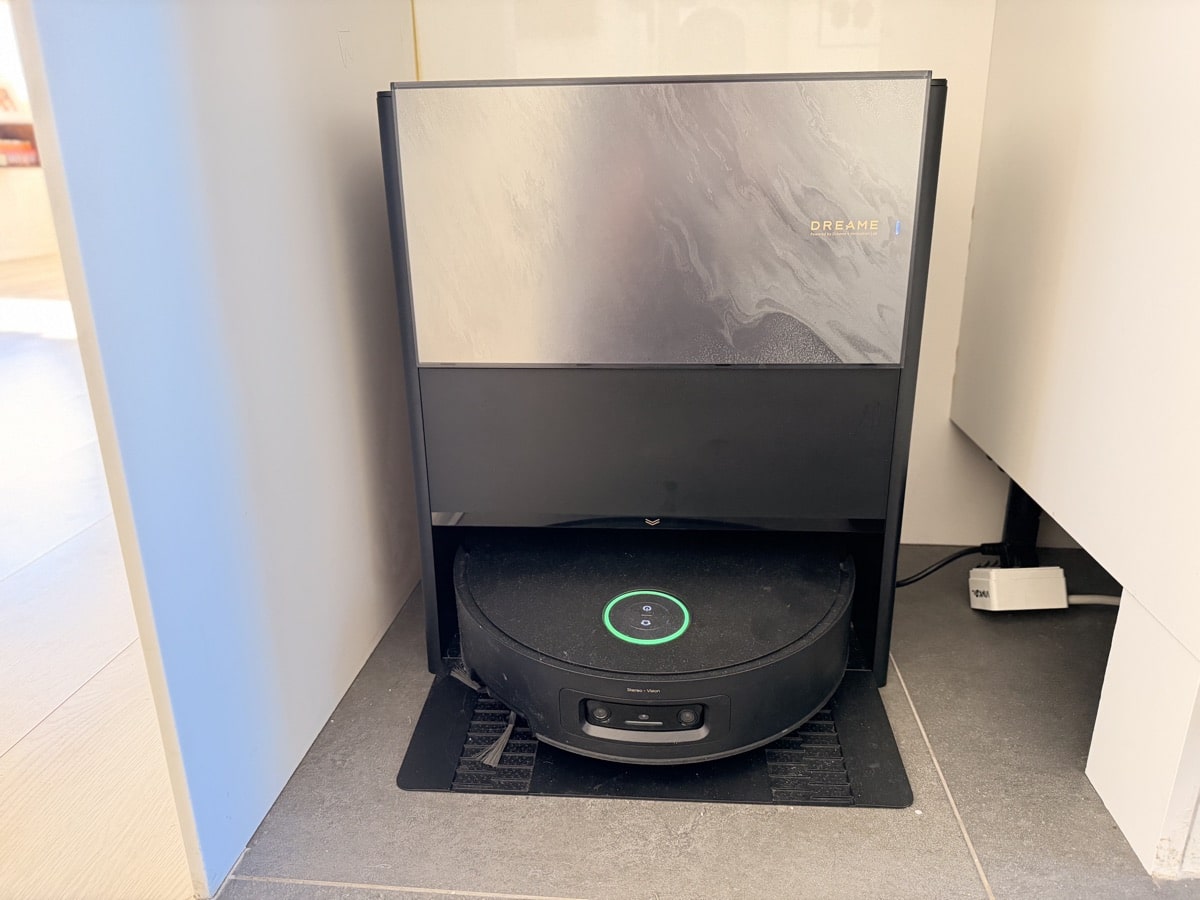 Designmæssigt har docken en marmoragtig plastikfront, som jeg først troede var en beskyttelsesfilm. Det er det ikke – det er Dreames forsøg på at give et eksklusivt udtryk. Personligt er jeg ikke fan, men da docken står under køkkenbordet, generer det ikke.