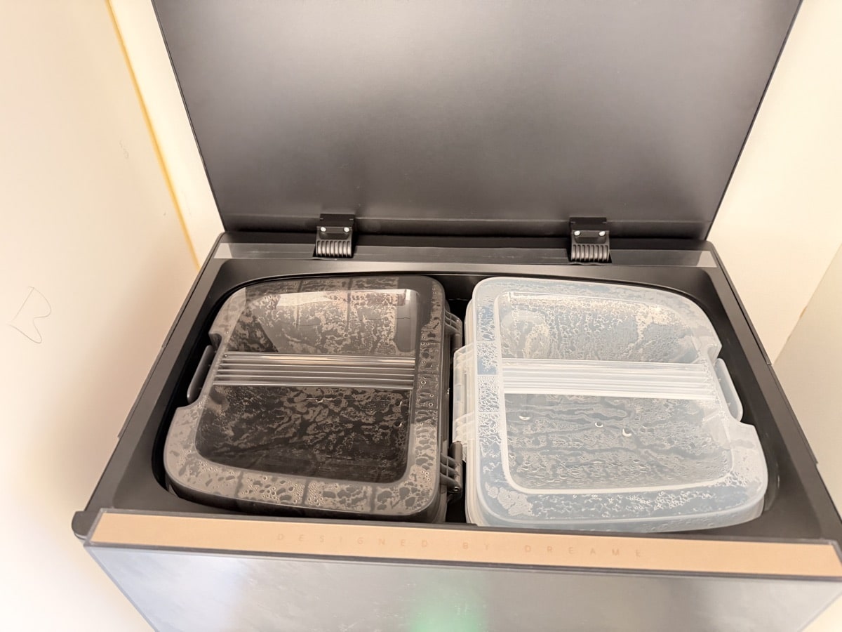 Som vi kender det fra Dreame, klarer docken både automatisk vandpåfyldning, moppevask, tørring og tømning af støvbeholderen. Der er to beholdere til rengøringsmiddel – én til almindeligt vaskemiddel og én til kæledyrsvenligt middel.