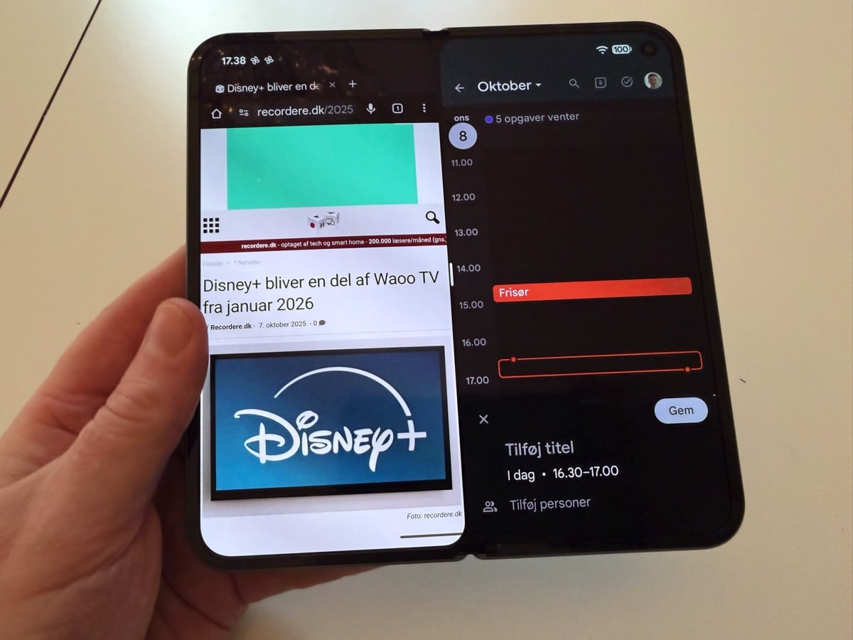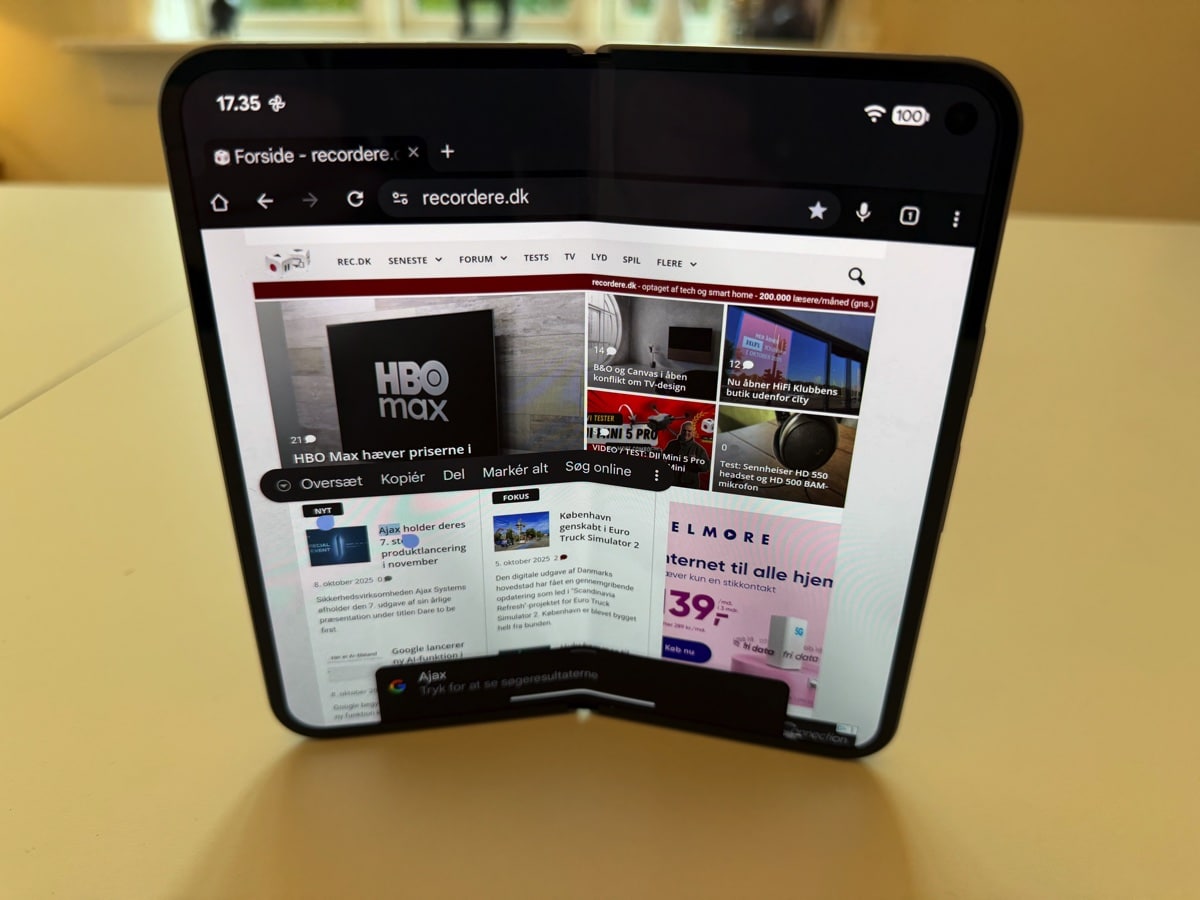 På Google Pixel 10 Pro Fold får man en meget bedre multitasking oplevelse, fordi man kan dele skærmen op, og så f.eks. køre Gmail på den ene side, og Google Calendar på den anden, og browser oplevelsen er også meget bedre, når du kører på den store skærm. Du kan trække og slippe fra en app til en anden, og du kan faktisk have tre apps kørende på den store skærm samtidigt.