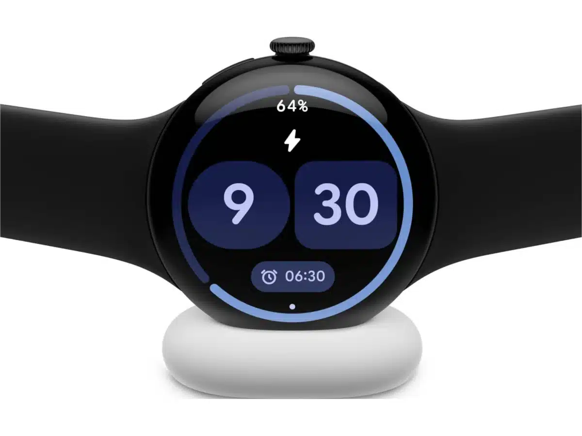 Sammen med uret får du Googles nye oplader, der bruger to kontaktpunkter på venstre side, og samtidigt fungerer det også som et nat ur, hvis du sætter det på dit sengebord.