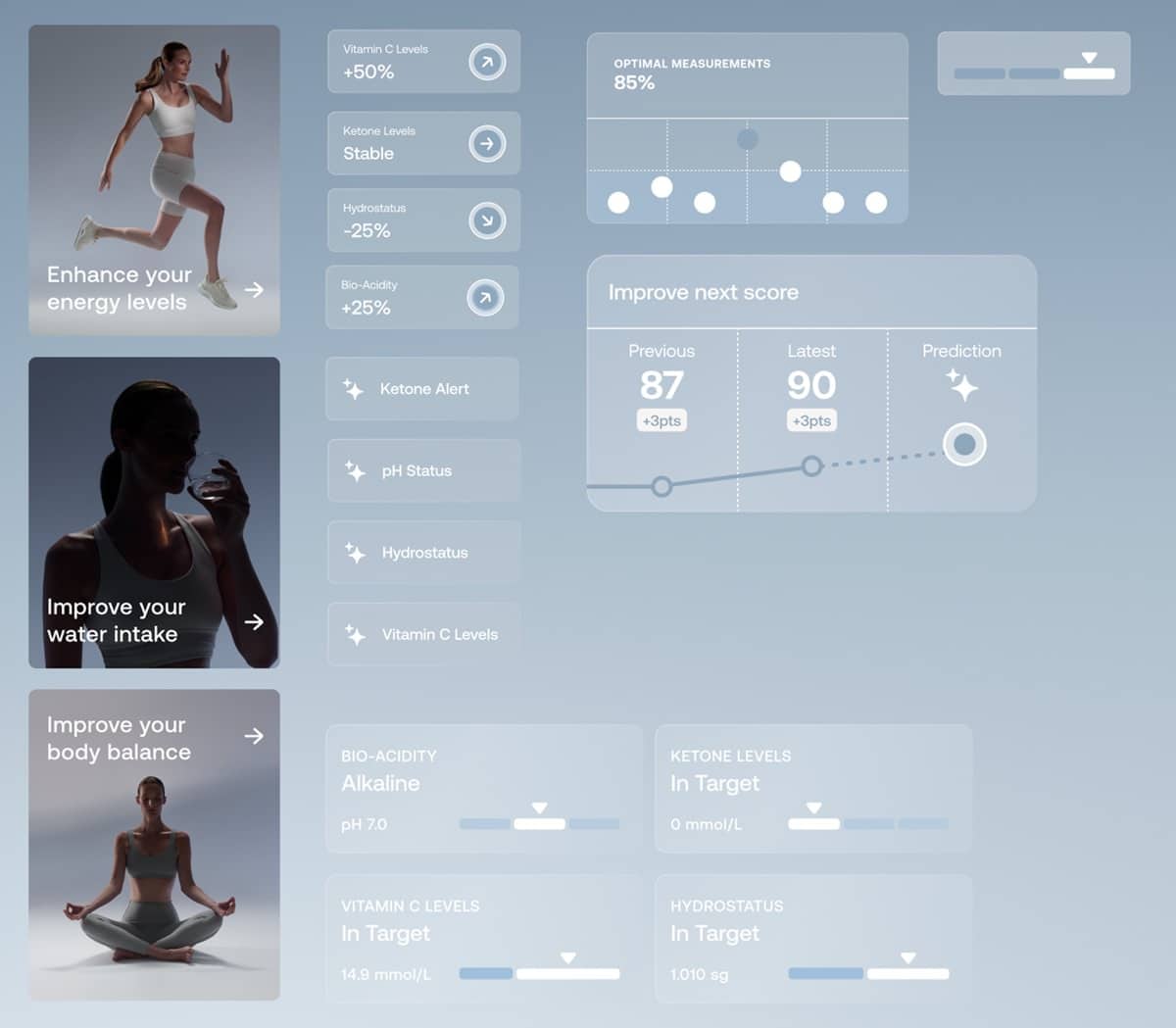 Første fokusområde er ernæring via U-Scan Nutrio, der måler fire biomarkører: pH, vægtfylde, ketoner og C-vitamin. Formålet er løbende at følge kroppens respons på kost og væskeindtag.