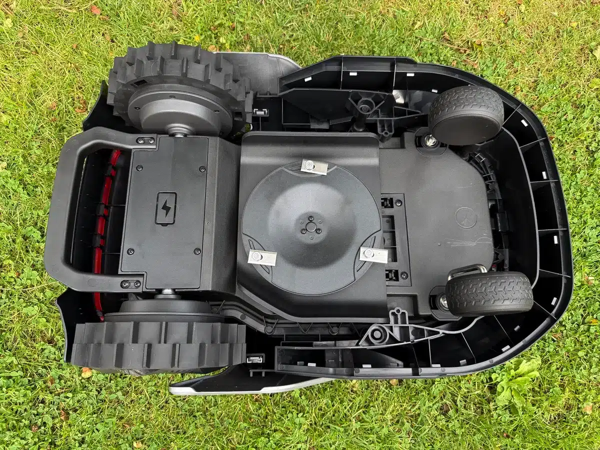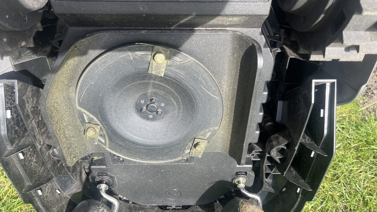 Jeg har henover sommeren renset Dreame A2 to gange. Det foregår ved at man sætter LIDAR hætten på, og vender plæneklipperen om på bagsiden, så man har bunden vendt op ad.